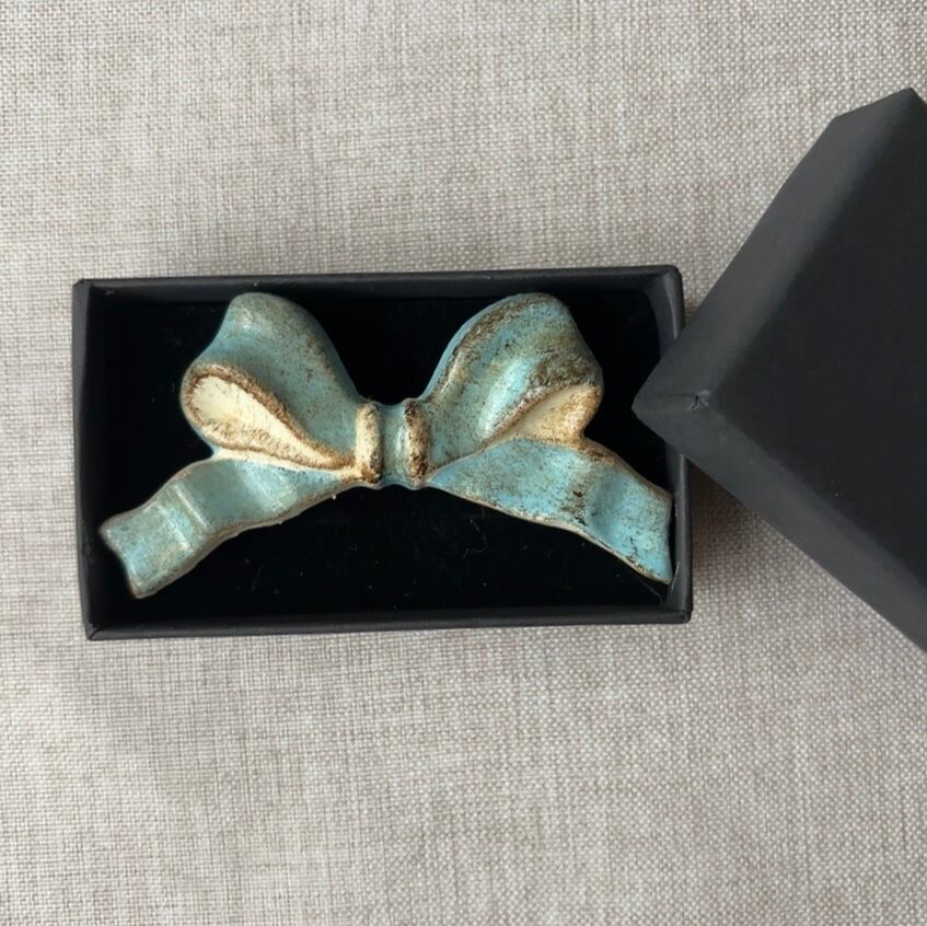 木製でできたイタリア製のリボンモチーフを帯留めにしました